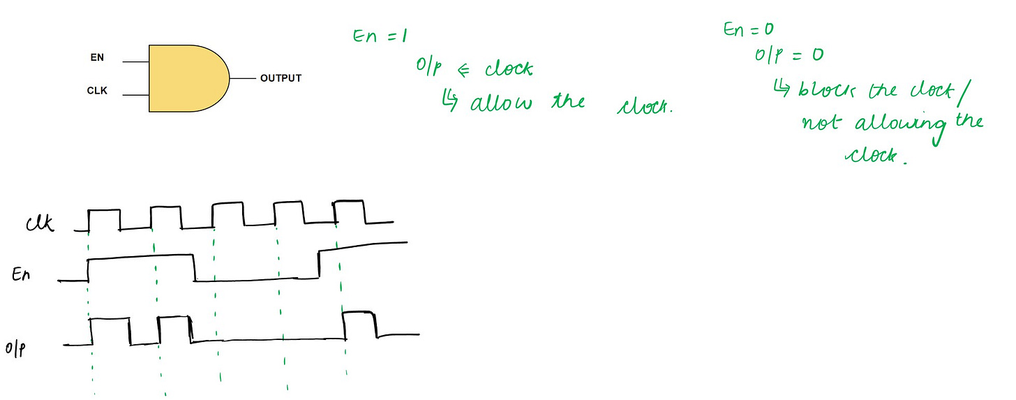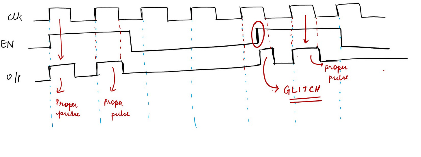 • And gate used as clock gating cell has a disadvantage. It will produce glitches whenever enable is changing when clock is high .